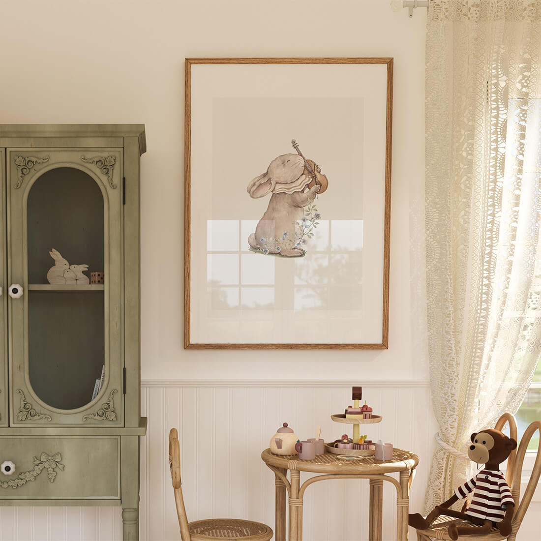 The fiddler bunny poster for children is a perfect idea for arranging empty and sad walls in a child's room. It perfectly matches the rest of the posters from the Watercolor collection.