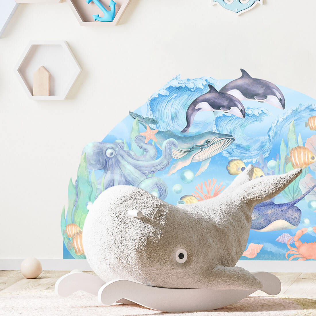 The collection of ocean wall stickers was created for lovers of life pulsating under the surface of the water. Hand-painted stickers from this series are beautiful, sea views and ocean depths full of fish, seaweed, crabs and shells. The entire series has been designed to perfectly harmonize with each other and create a coherent composition.