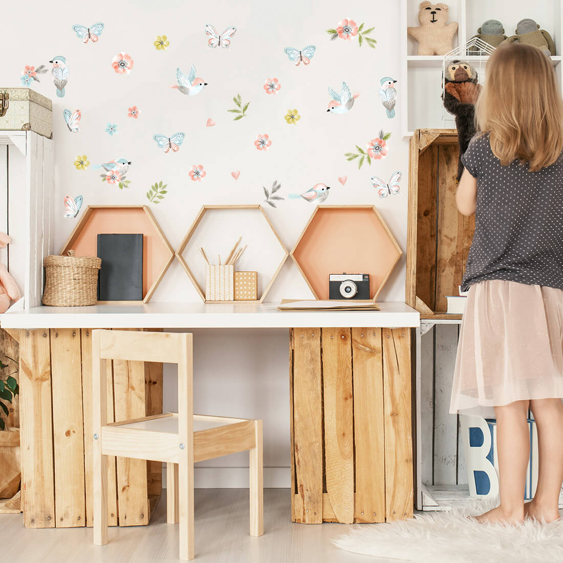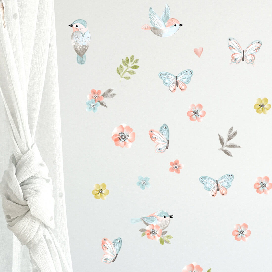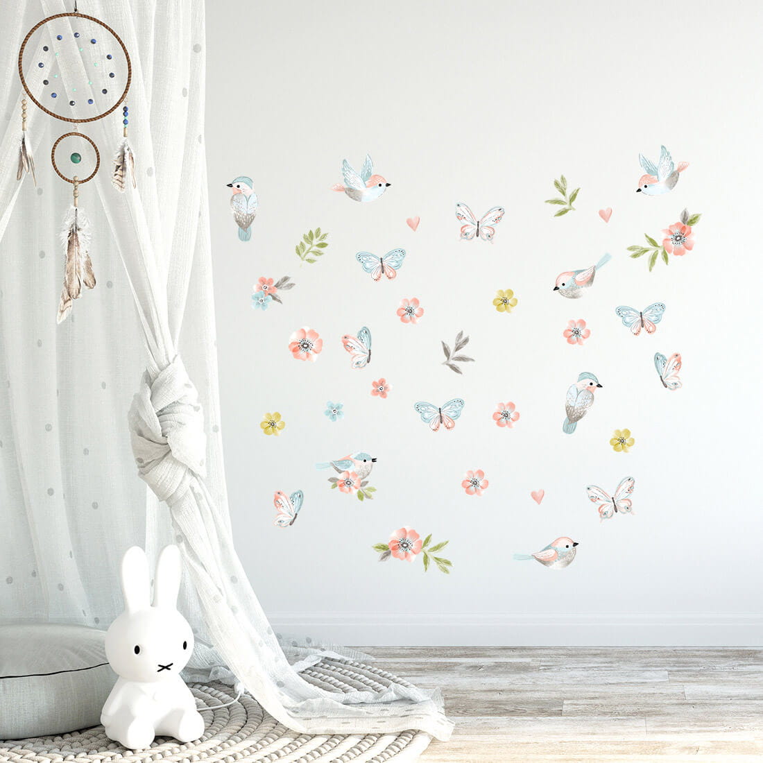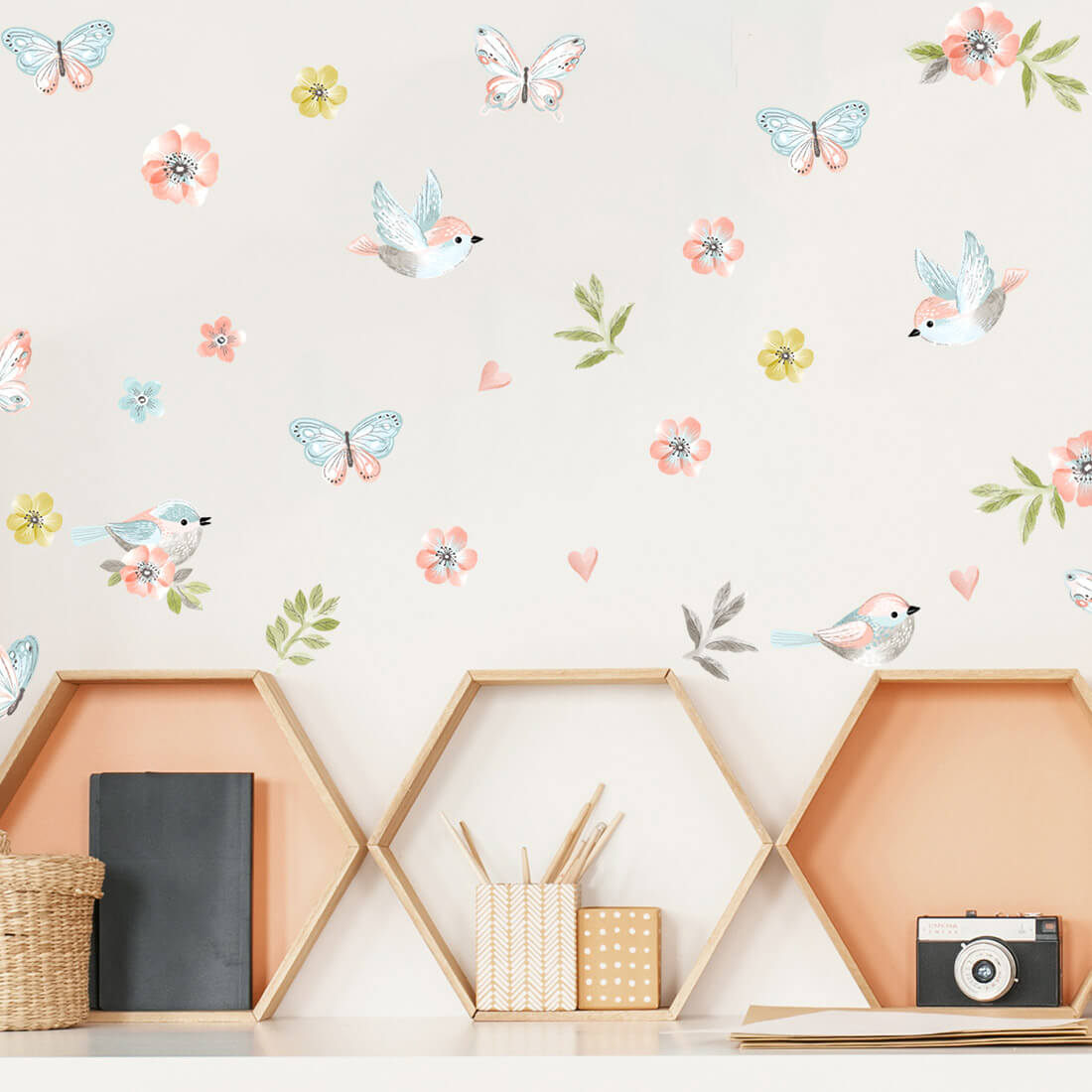 Birds' stickers are a fantastic alternative to traditional wallpapers that will change any interior in a fast and unconventional way, giving it a unique atmosphere of a forest meadow full of birds, butterflies and flowers.