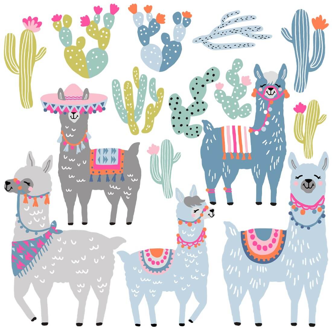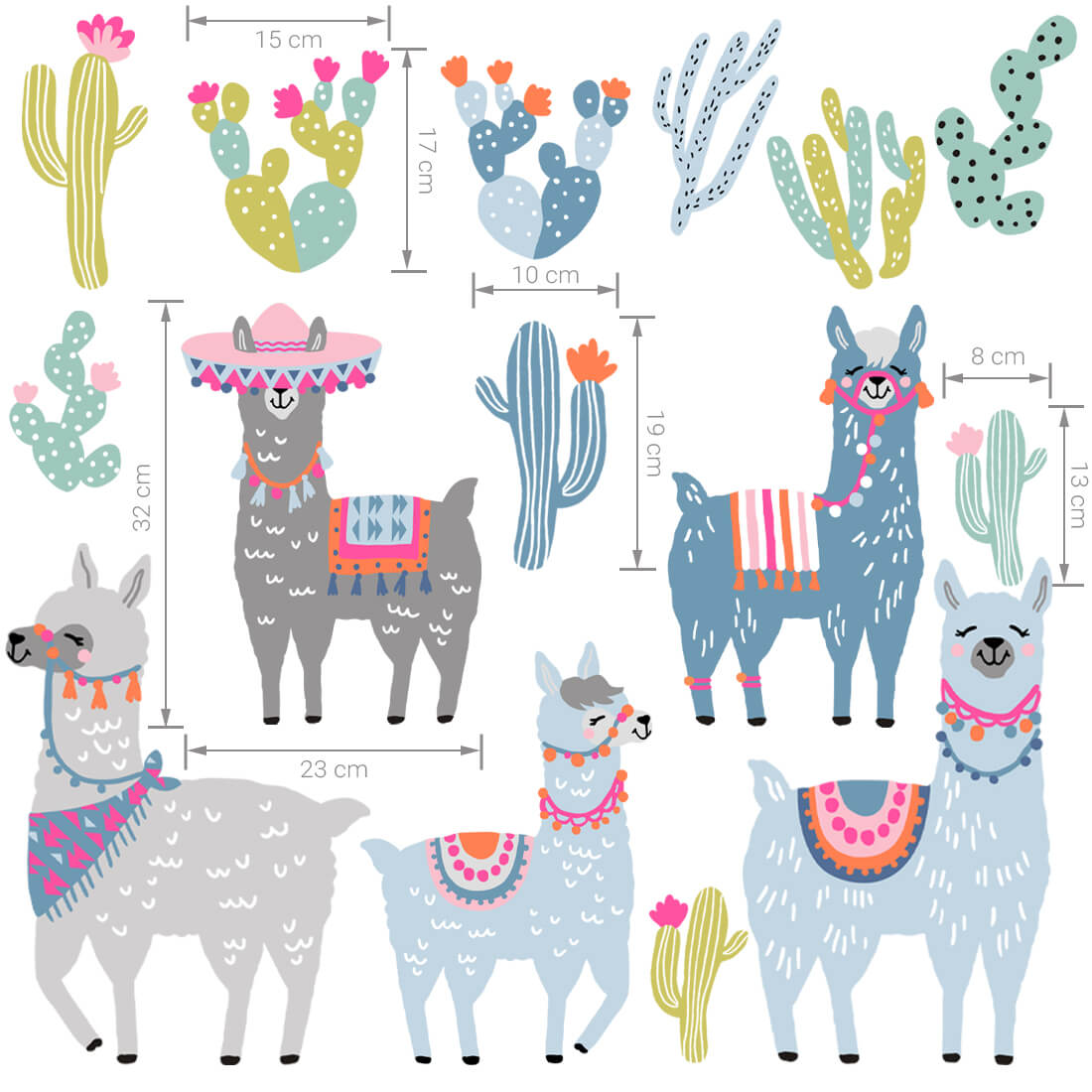 The set includes: 4 multicolored llamas, 10 South American cacti. The exact dimensions are given in the last photo.