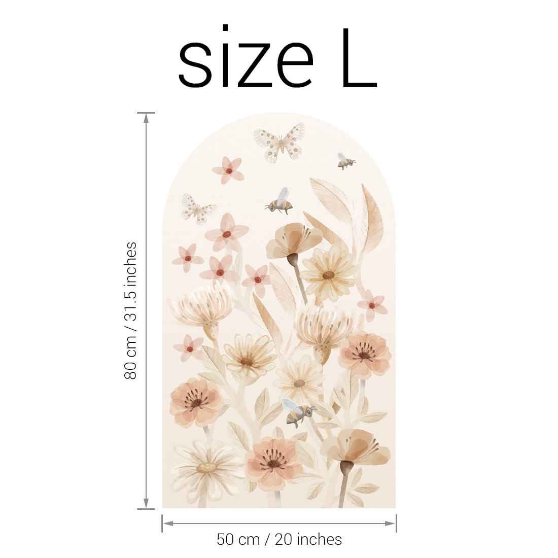 Arch-shaped wall sticker with flowers - this delicate composition of wildflowers, grasses, and leaves transports you straight to a fragrant summer meadow. Designed in soft, earthy tones, the sticker adds harmony, warmth, and a sense of closeness to nature – exactly what a little one’s space needs.