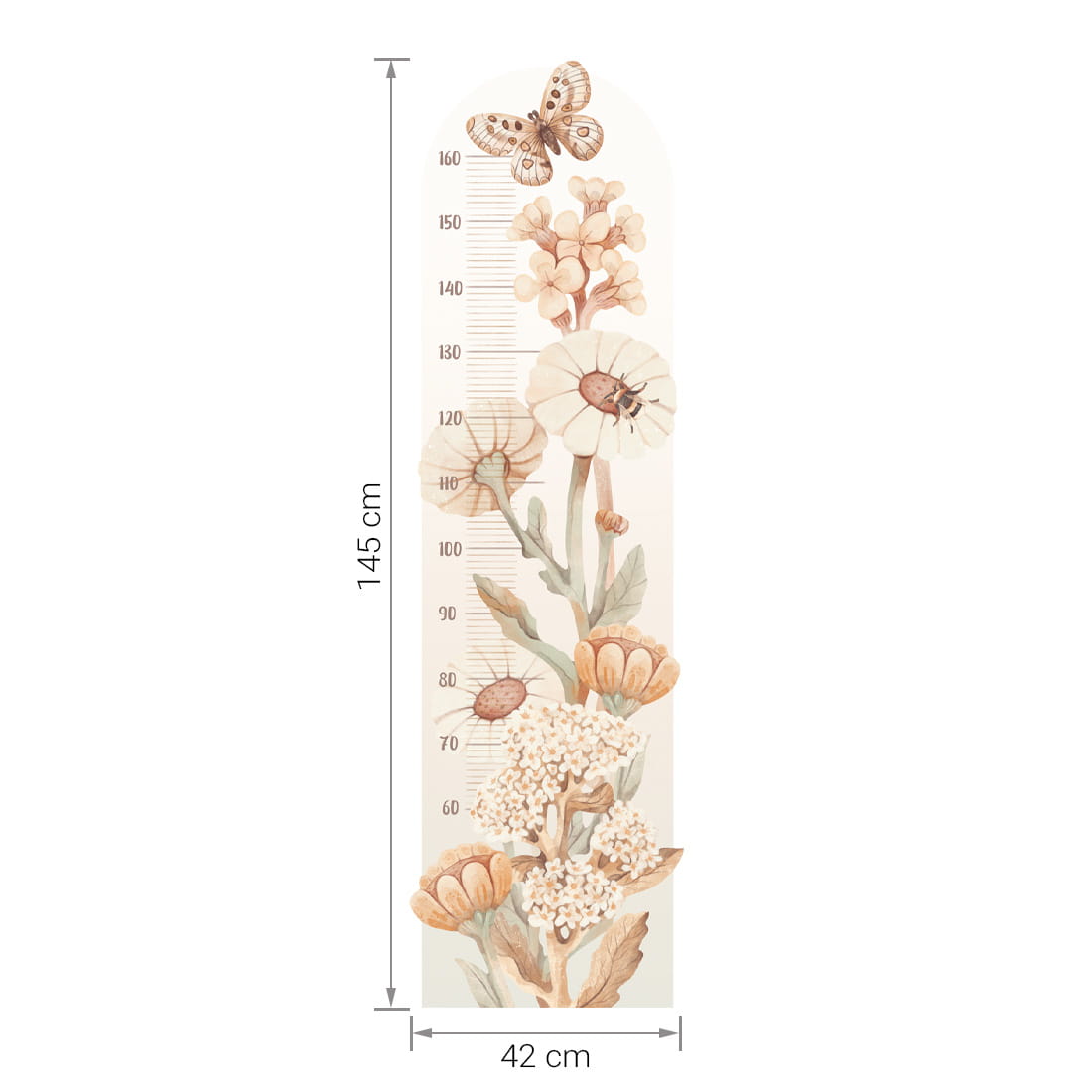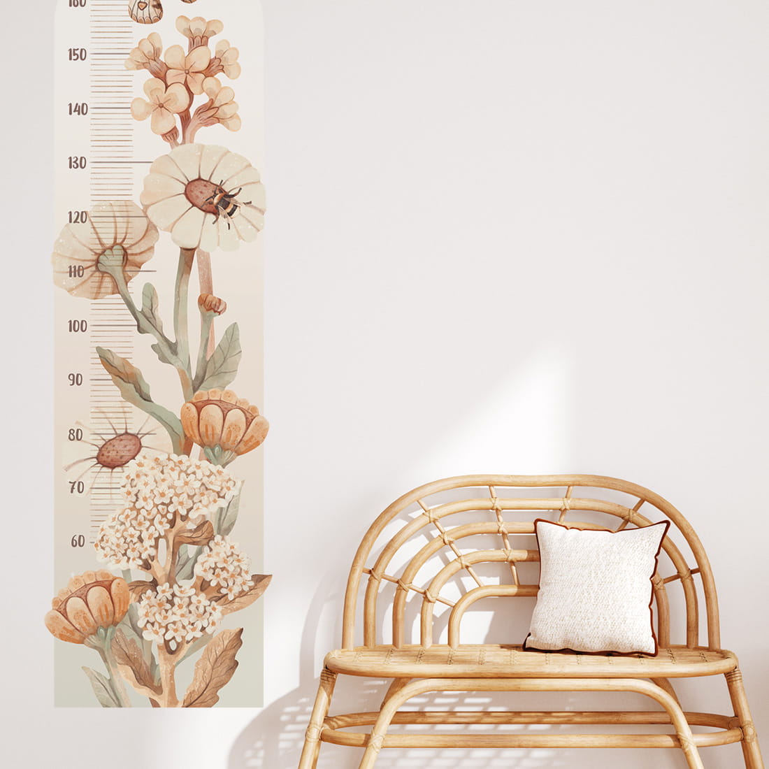 The Boho Flowers Height Measure wall sticker - it features boho floral motifs, butterflies, and bees, perfectly fitting into a warm and natural atmosphere, giving the child's room a cozy yet creative character. Warm shades of brown, beige, and orange create a harmonious, cozy ambiance, perfectly aligning with Scandinavian and boho styles.