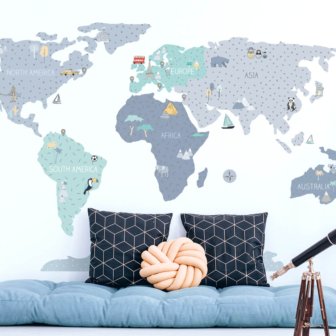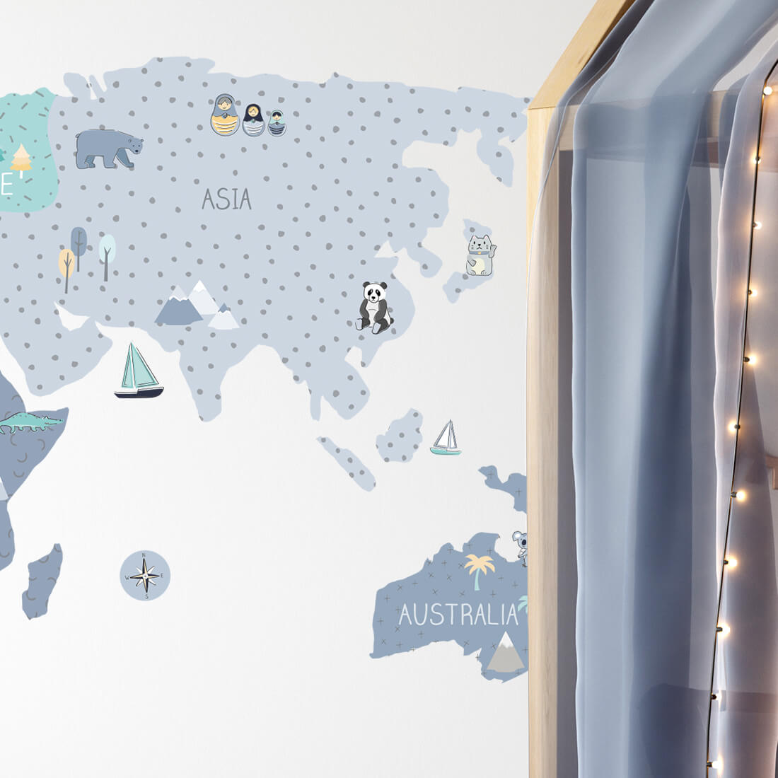 Blue world maps are products of the highest quality, made with the utmost care and attention to details, maintained in subdued Scandinavian colors that perfectly blend into the child’s space.