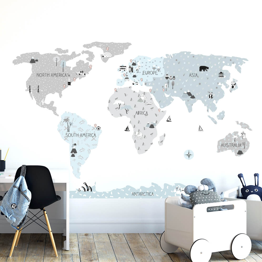 Each element of the map is carefully cut out of the contour and glued separately, what makes the application easier, especially in the case of large spaces. The size of the sticker is measured after its application to the wall, while the continents are at the appropriate distance from each other.