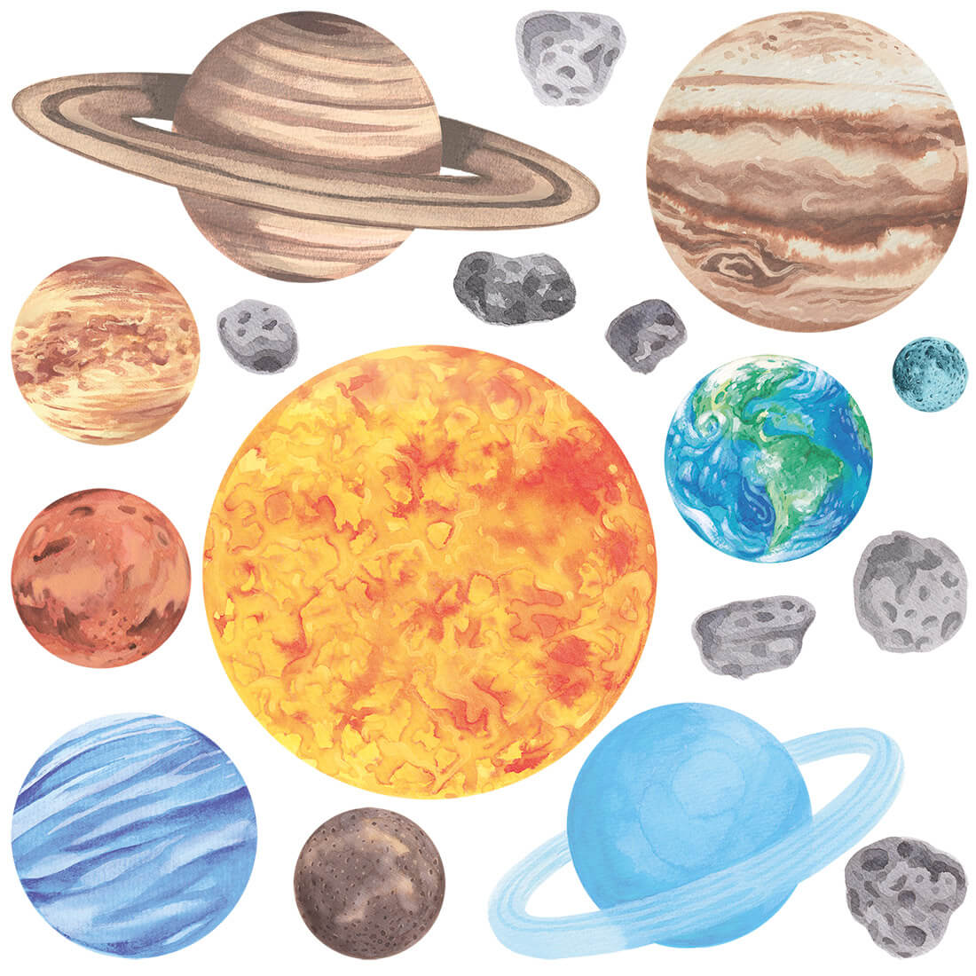 Solar system stickers are a great way to add an unearthly space theme to your child's room. The set of stickers contains 8 planets: Mercury, Venus, Earth, Mars, Jupiter, Saturn, Uranus and Neptune. The kit also includes the sun, moon and several asteroids.