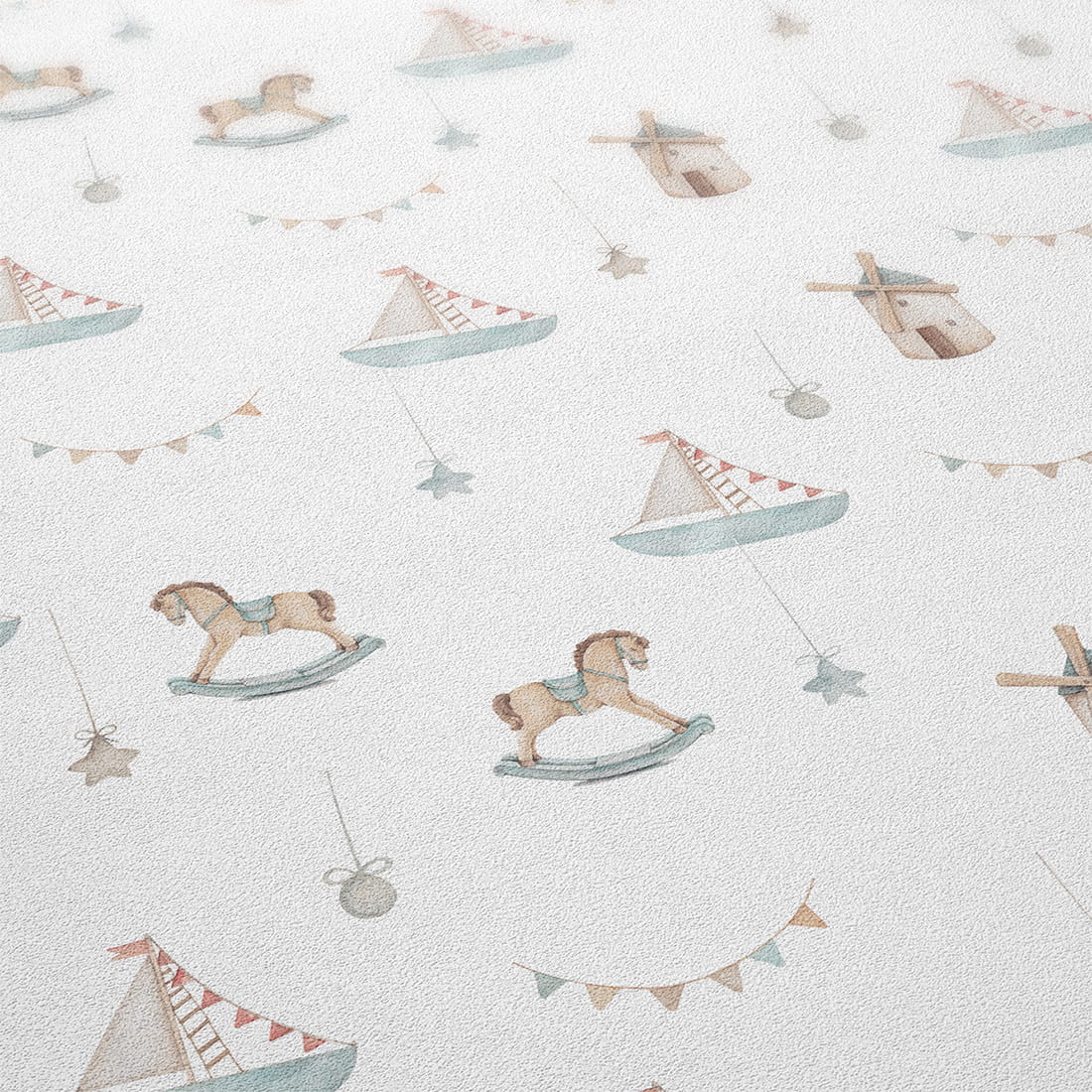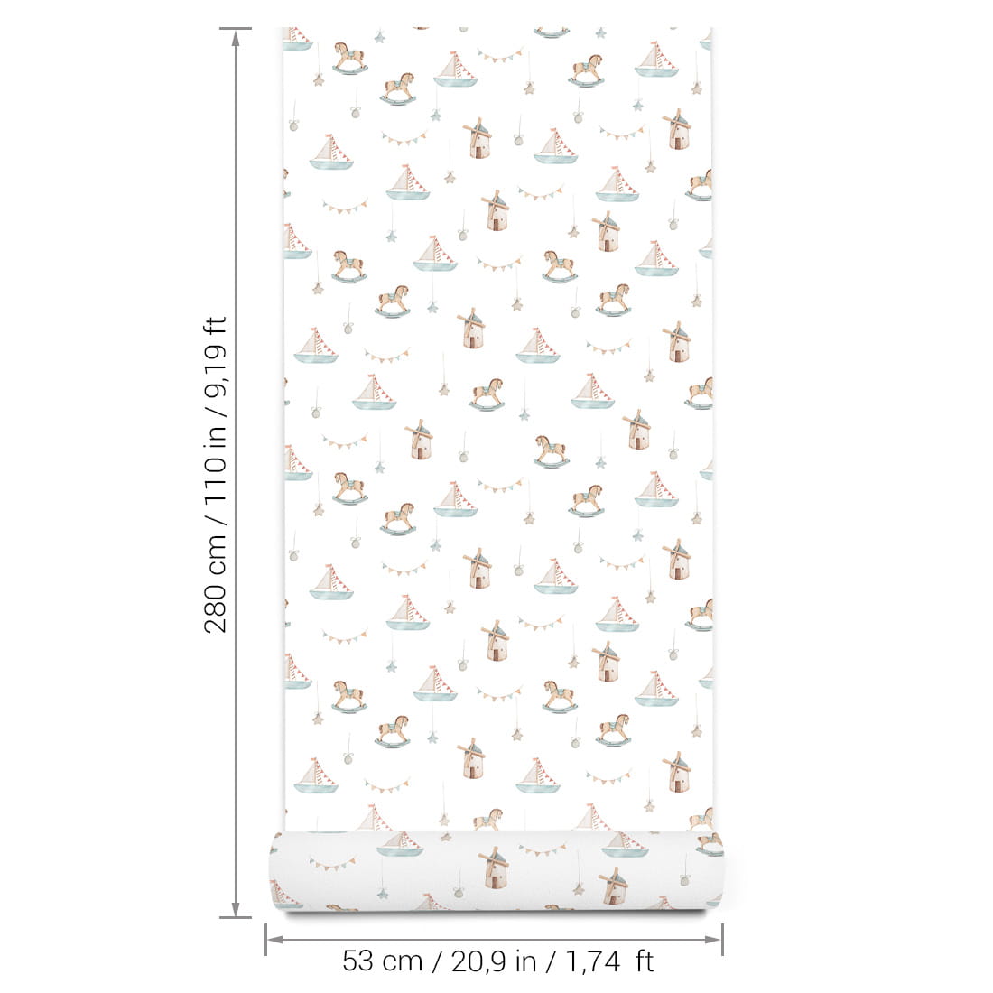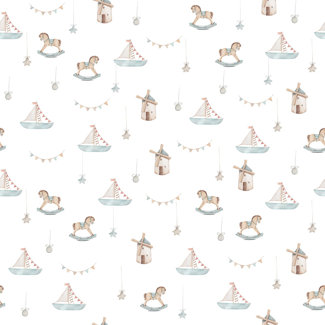 Wallpaper for children TOYS - this is a delightful design that brings warmth and childlike joy into your little one’s room. Against a white background, charming watercolor illustrations — adorable boats, a classic rocking horse, and a windmill — appear, adorned with subtle blue accents.